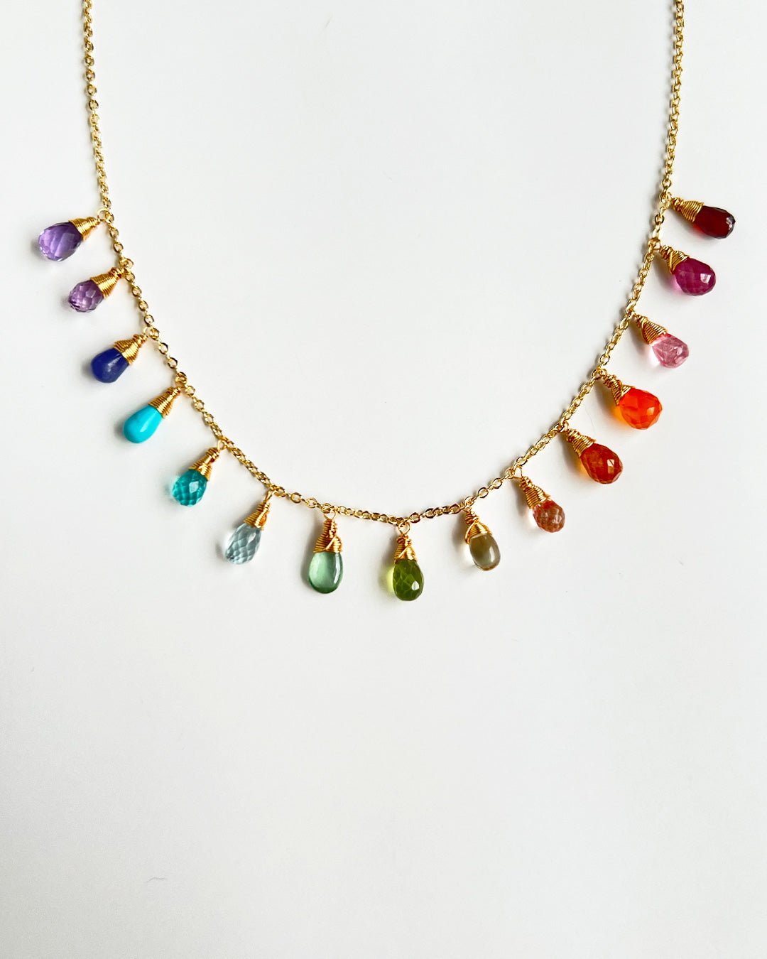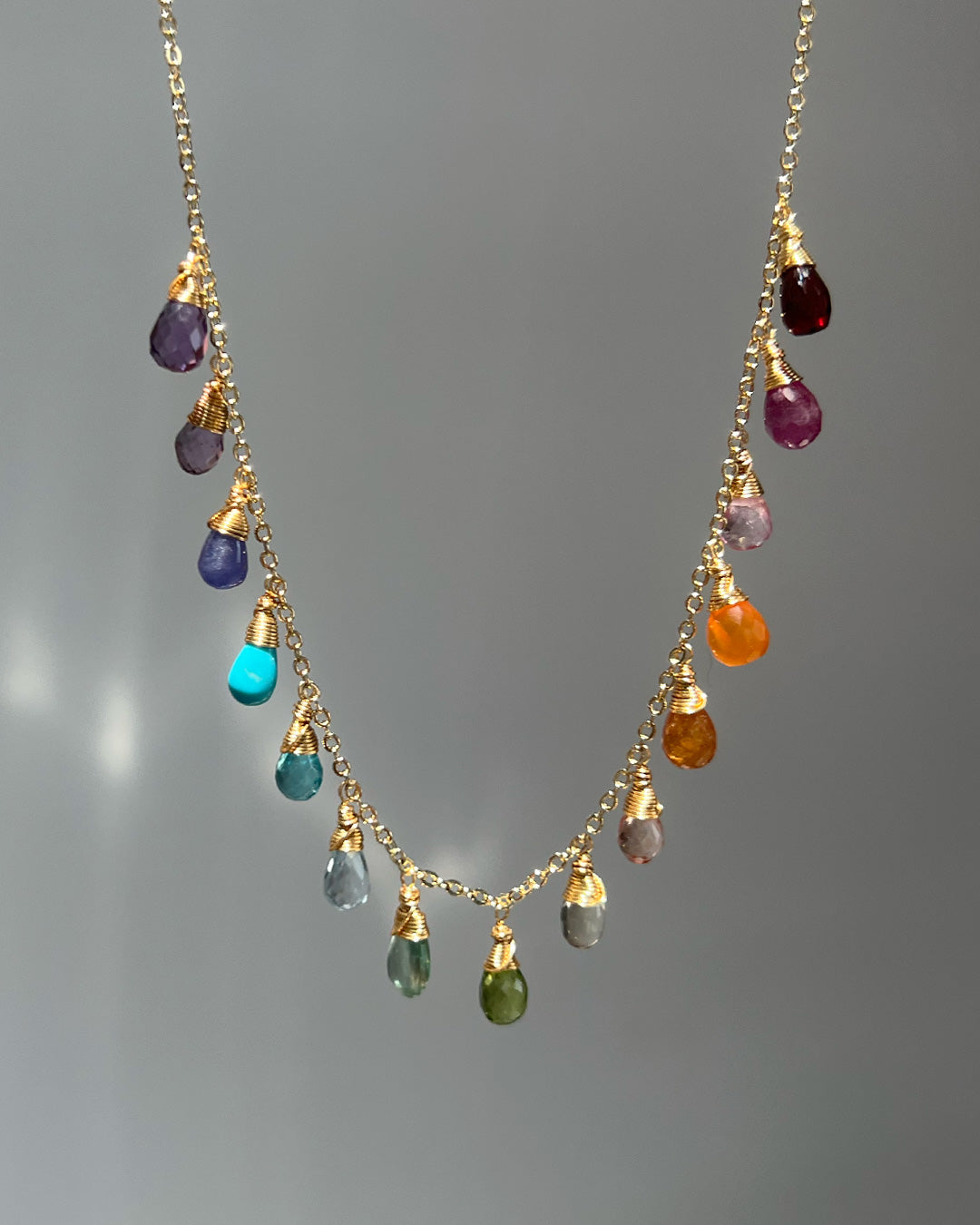 14kgfのチェーンに、しずく型を中心とした天然石がバランスよく並び、虹のよう