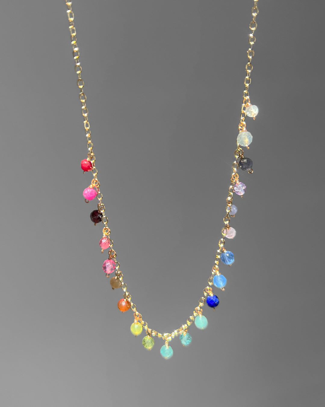 色とりどりの天然石を、14kgfチェーンに一粒ずつ丁寧に並べたネックレス。