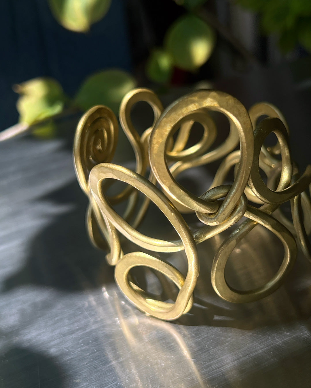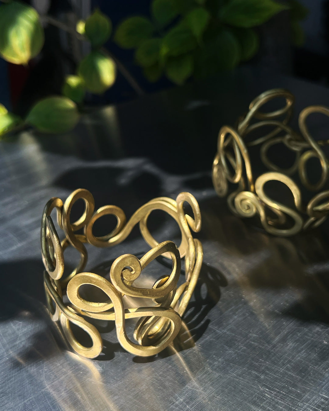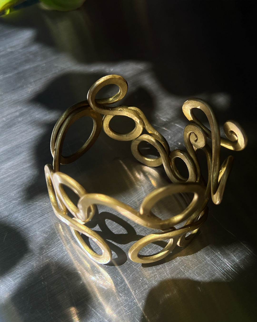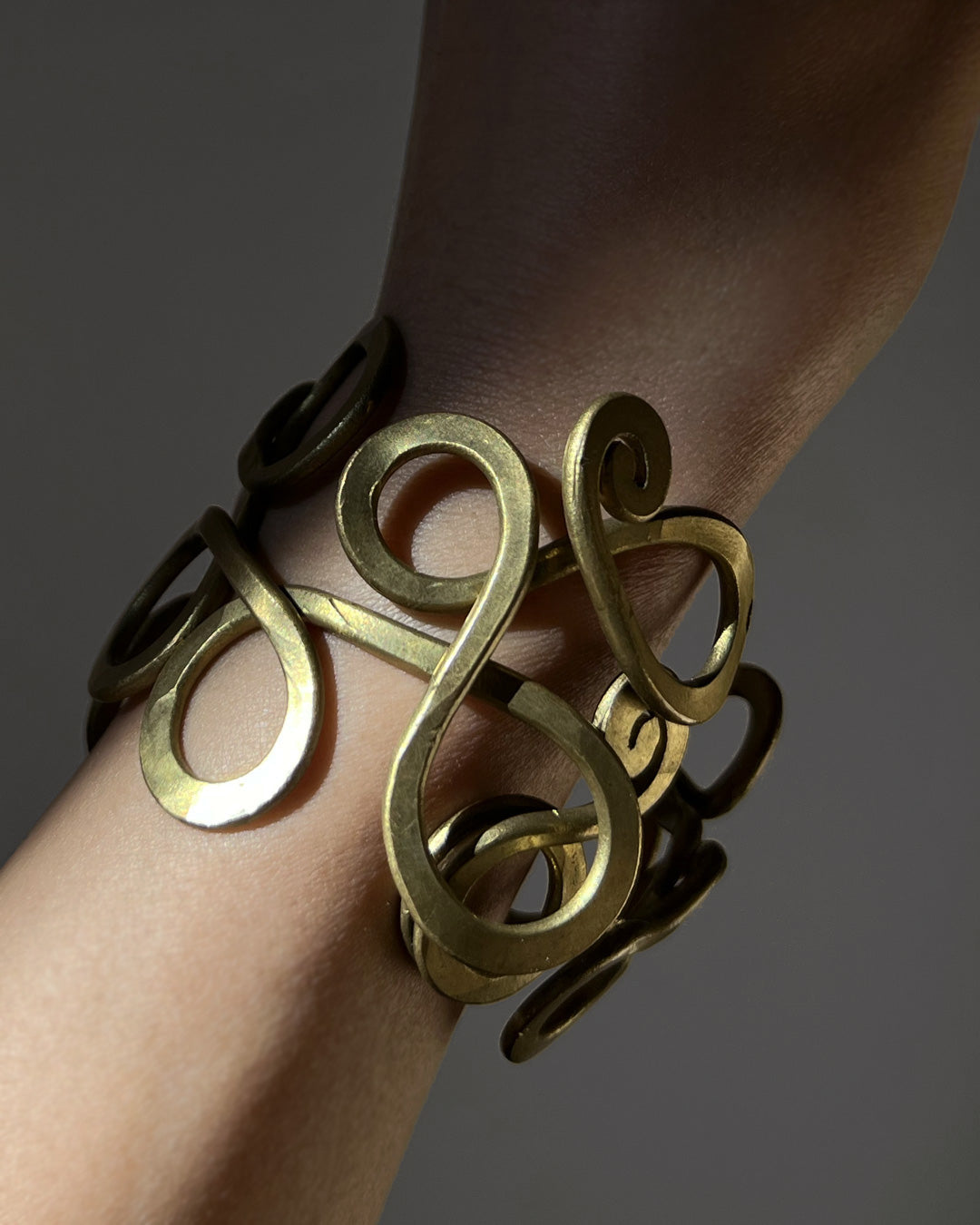 繊細に絡み合う曲線が印象的な、真鍮製のバングル。