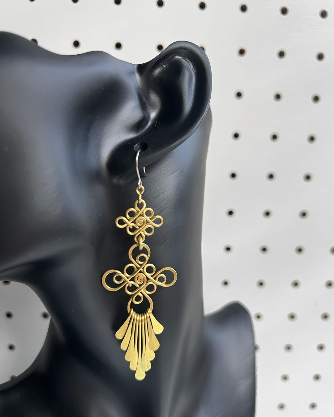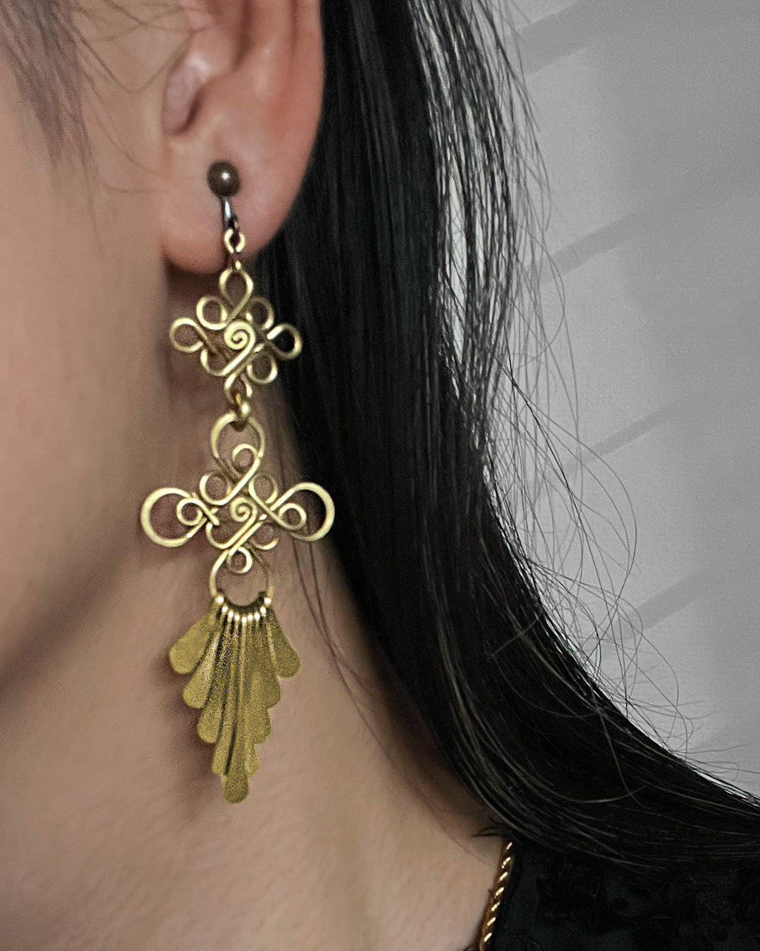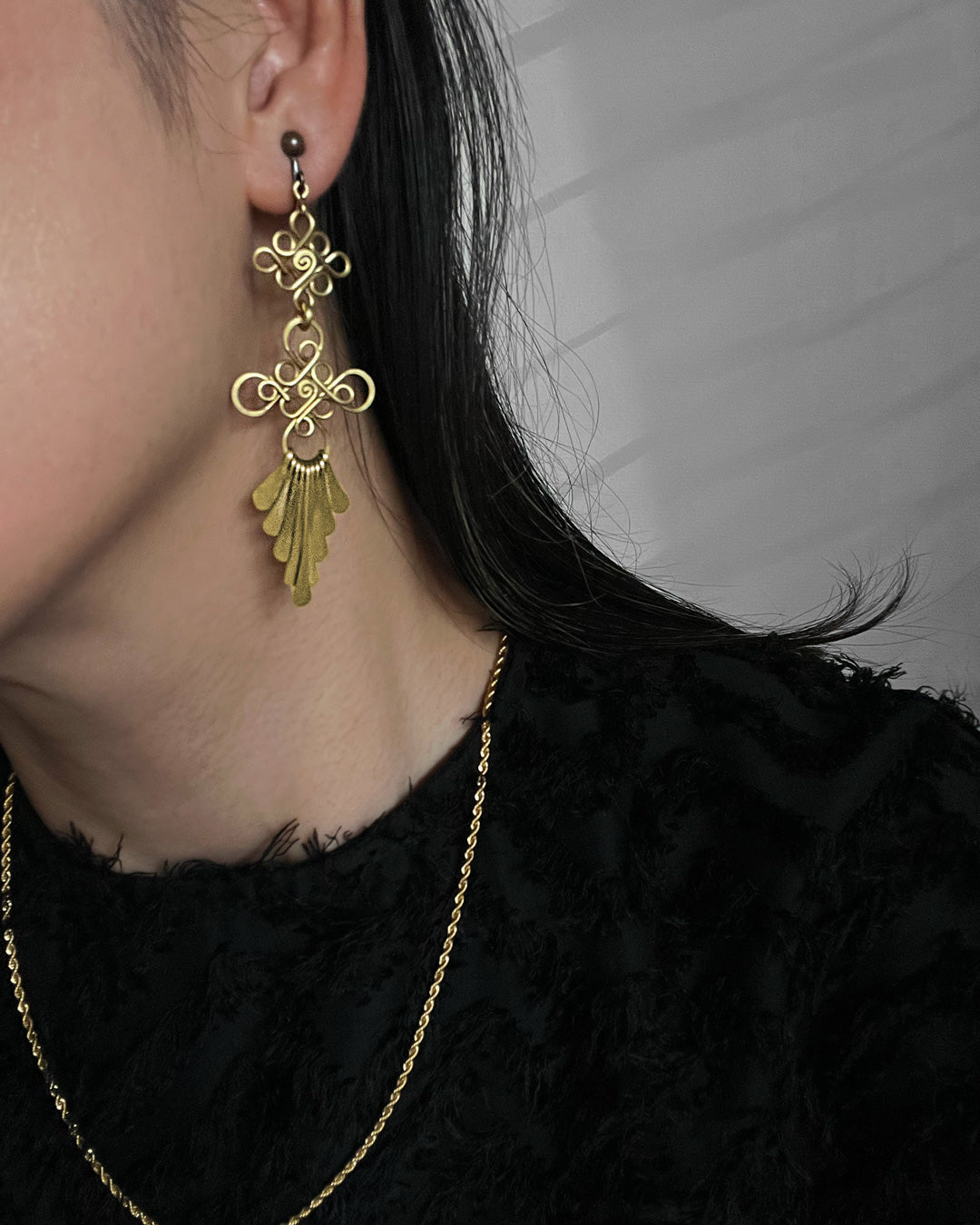 繊細なアラベスク模様に、優美な扇型チャームをあしらったピアス&イヤリング。